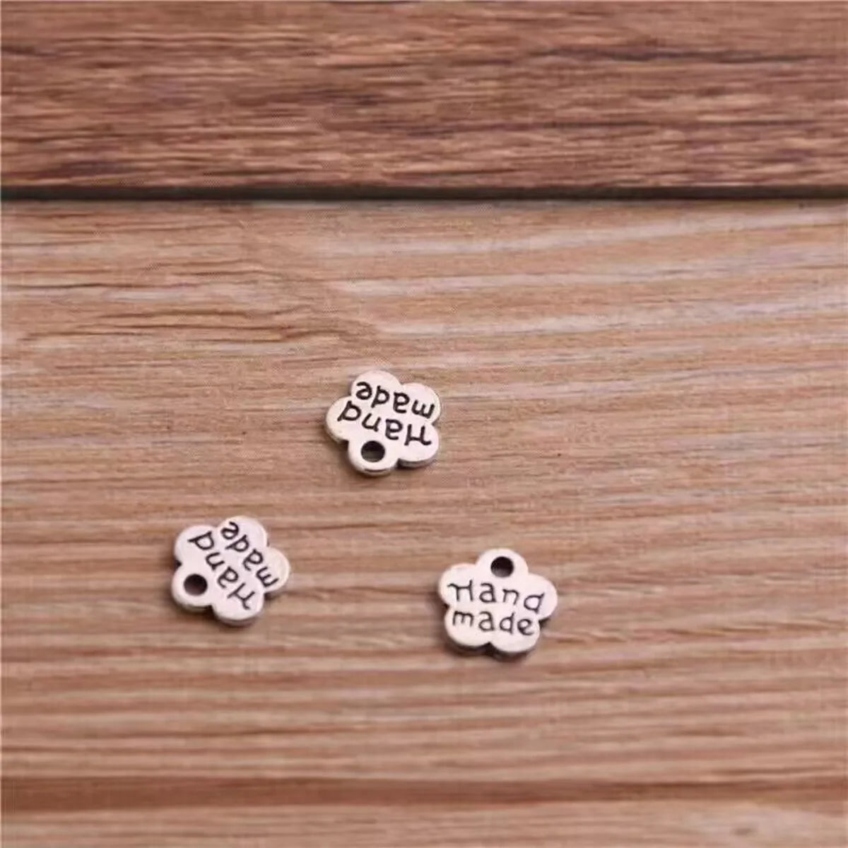 Add a charming handmade touch to your designs with these small flower-shaped metal charms featuring a “hand made” inscription. Their compact size makes them perfect as spacers, accent charms, or detail pieces for handmade jewelry and craft projects.