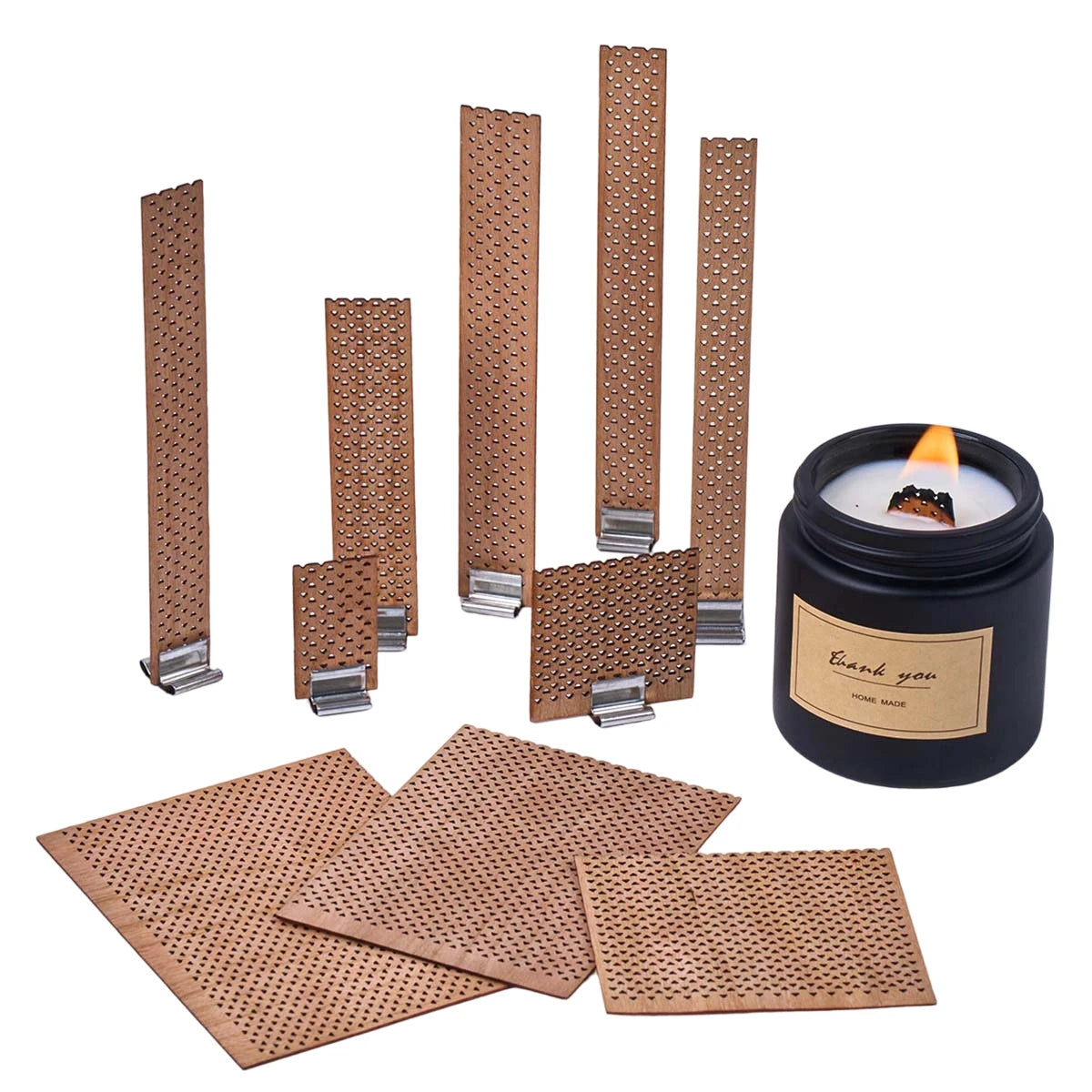 These smokeless wooden candle wicks with metal brackets are designed for DIY and handmade candle making. The flat wooden wick structure provides a steady flame and an elegant burn, ideal for container and jar candles.