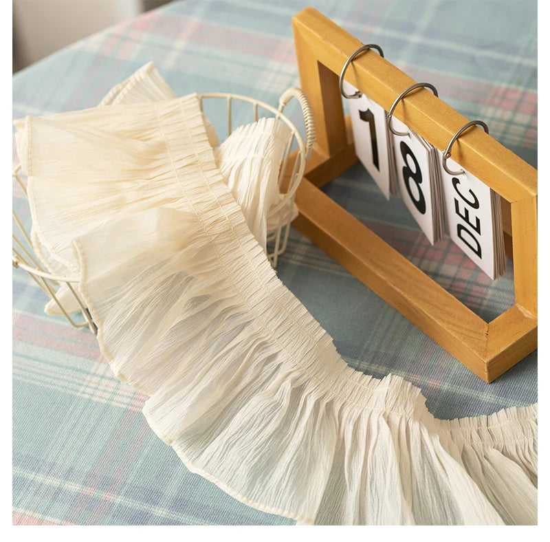 Soft pleated lace trim made from milk silk fabric, designed for decorative sewing and DIY projects. This ruffle-style lace features a lightweight drape with evenly pleated folds, adding movement and texture to garments and handmade creations.