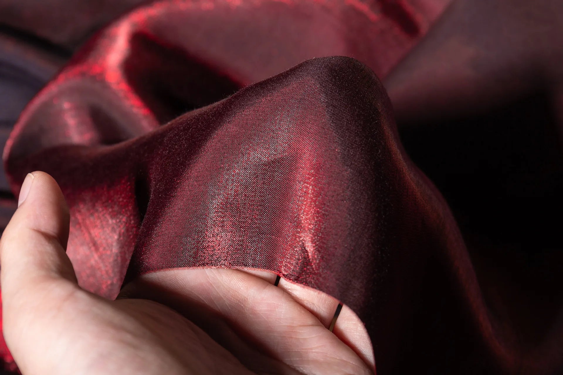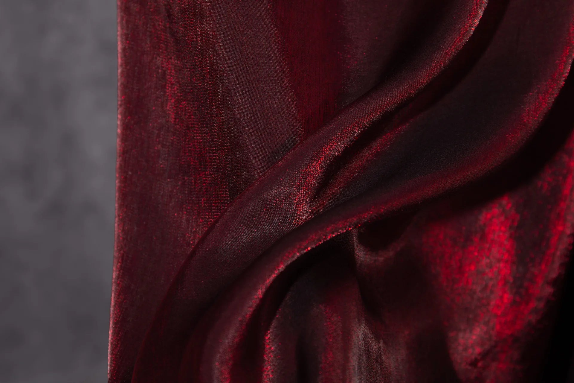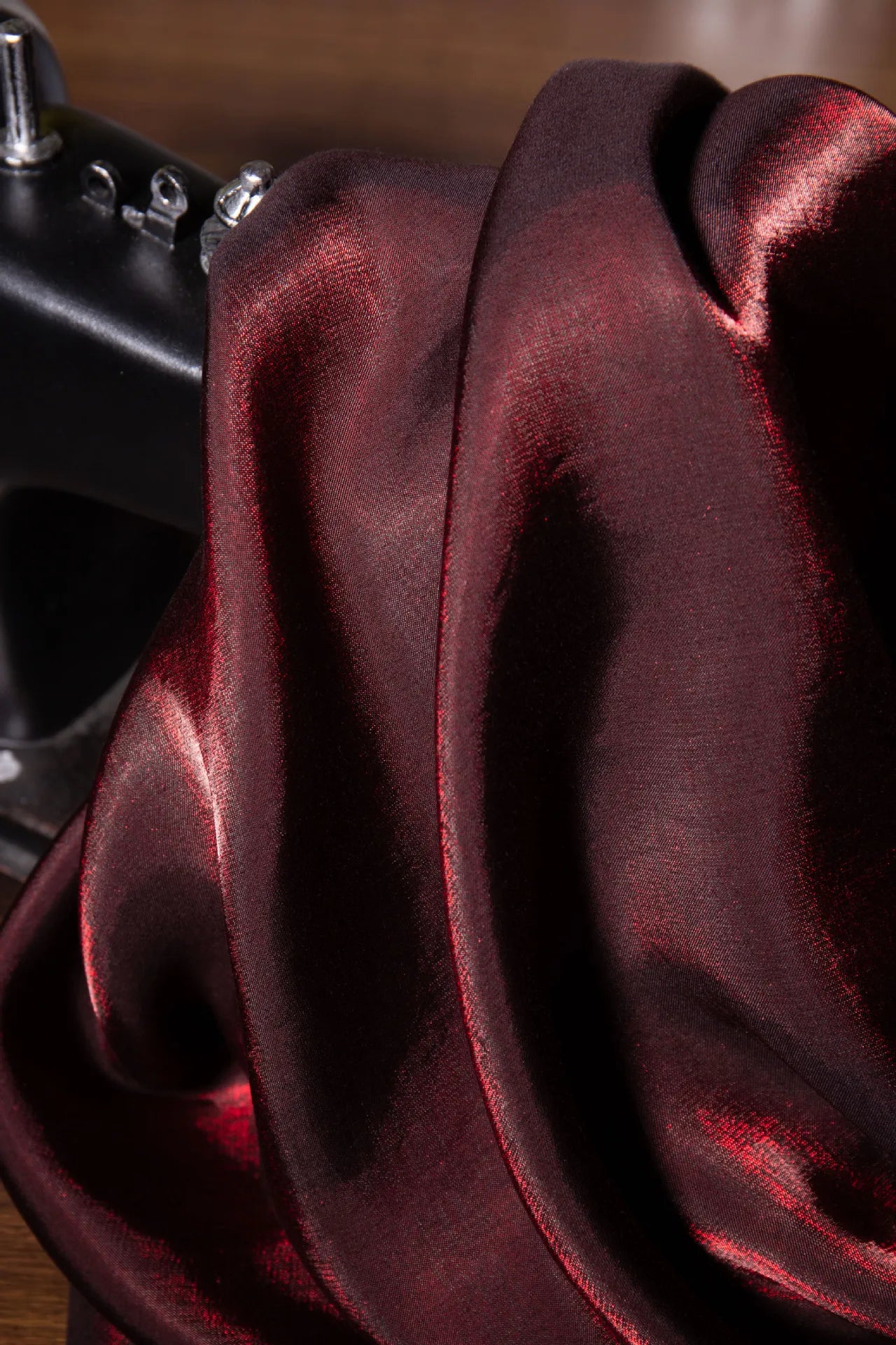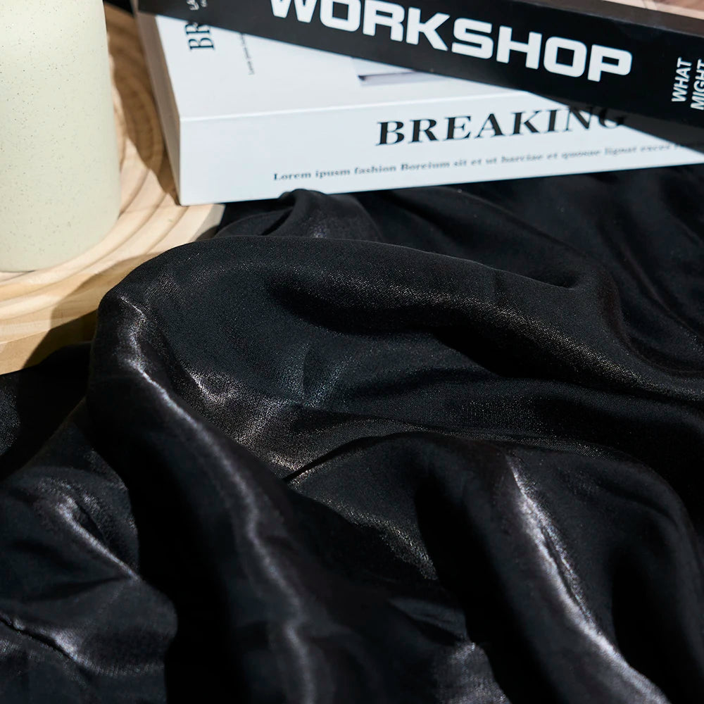 Elegant wine red shimmer fabric with a soft glazed silk look and subtle glitter effect. This fabric reflects light beautifully, creating a rich gradient shine that changes under different lighting conditions. The surface is smooth, breathable, and skin-friendly, making it comfortable to wear while still looking luxurious.