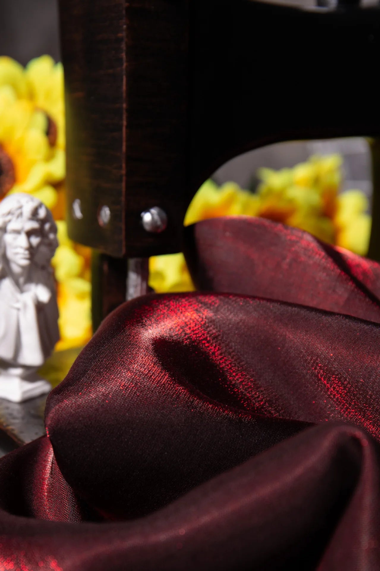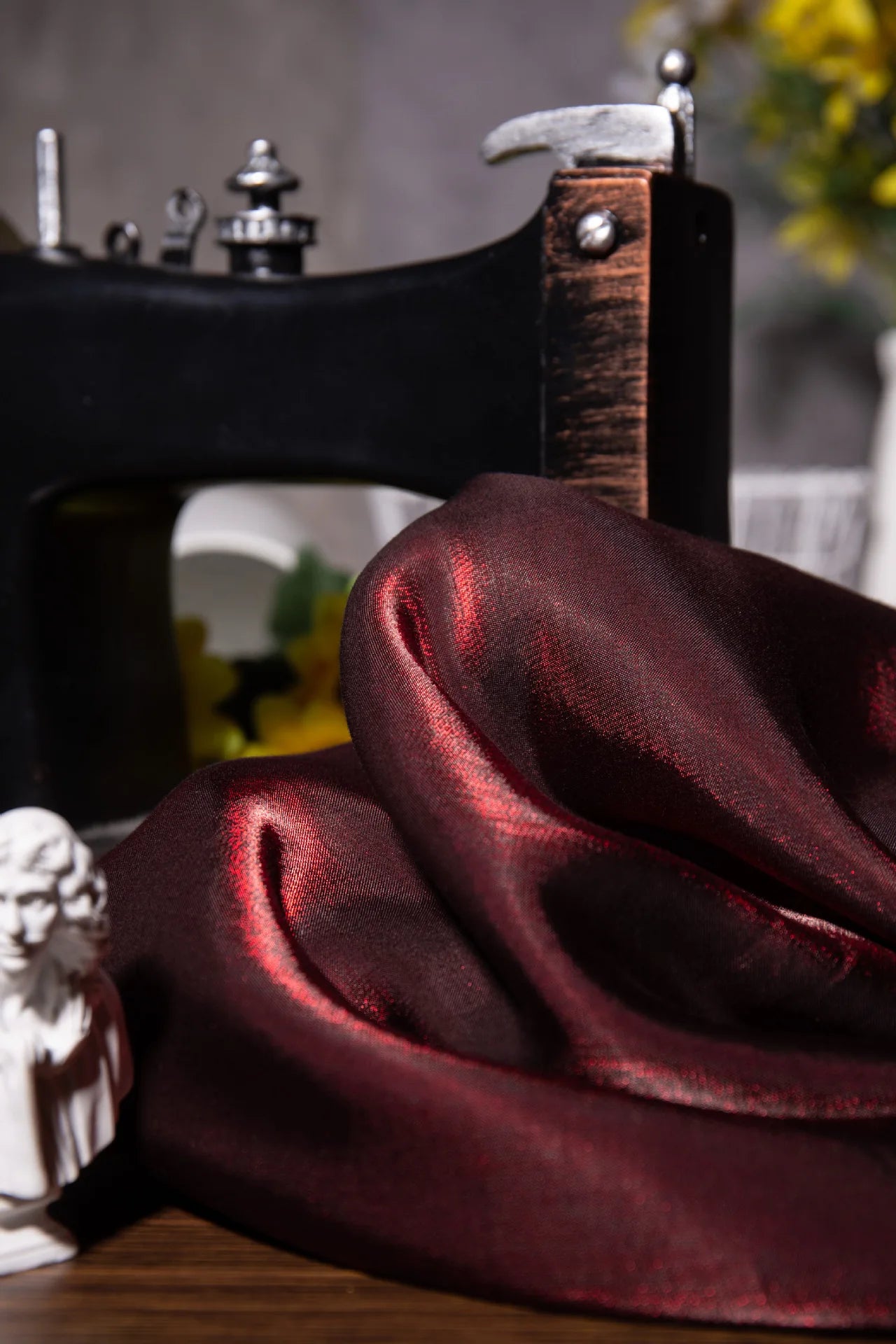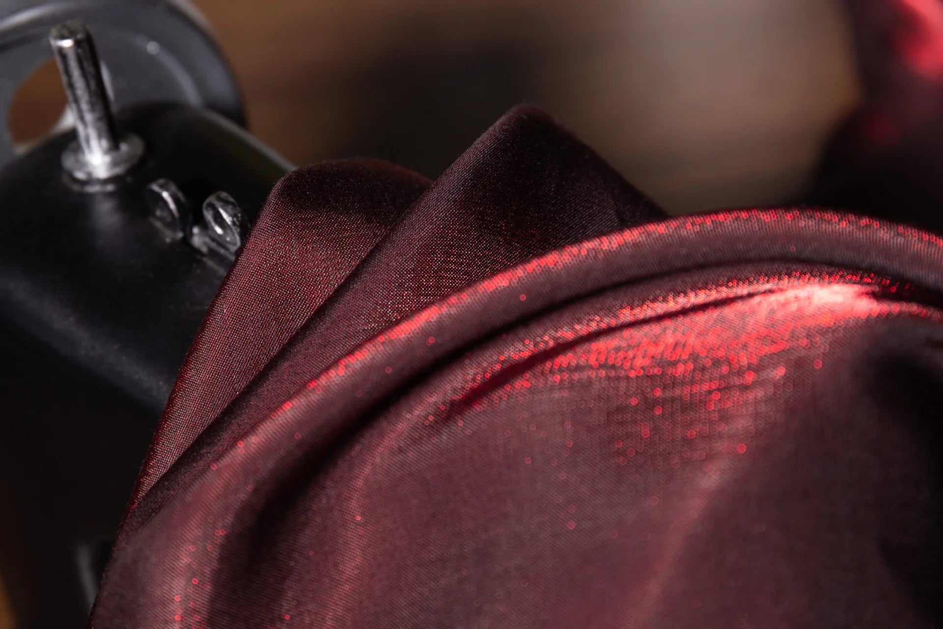 Elegant wine red shimmer fabric with a soft glazed silk look and subtle glitter effect. This fabric reflects light beautifully, creating a rich gradient shine that changes under different lighting conditions. The surface is smooth, breathable, and skin-friendly, making it comfortable to wear while still looking luxurious.