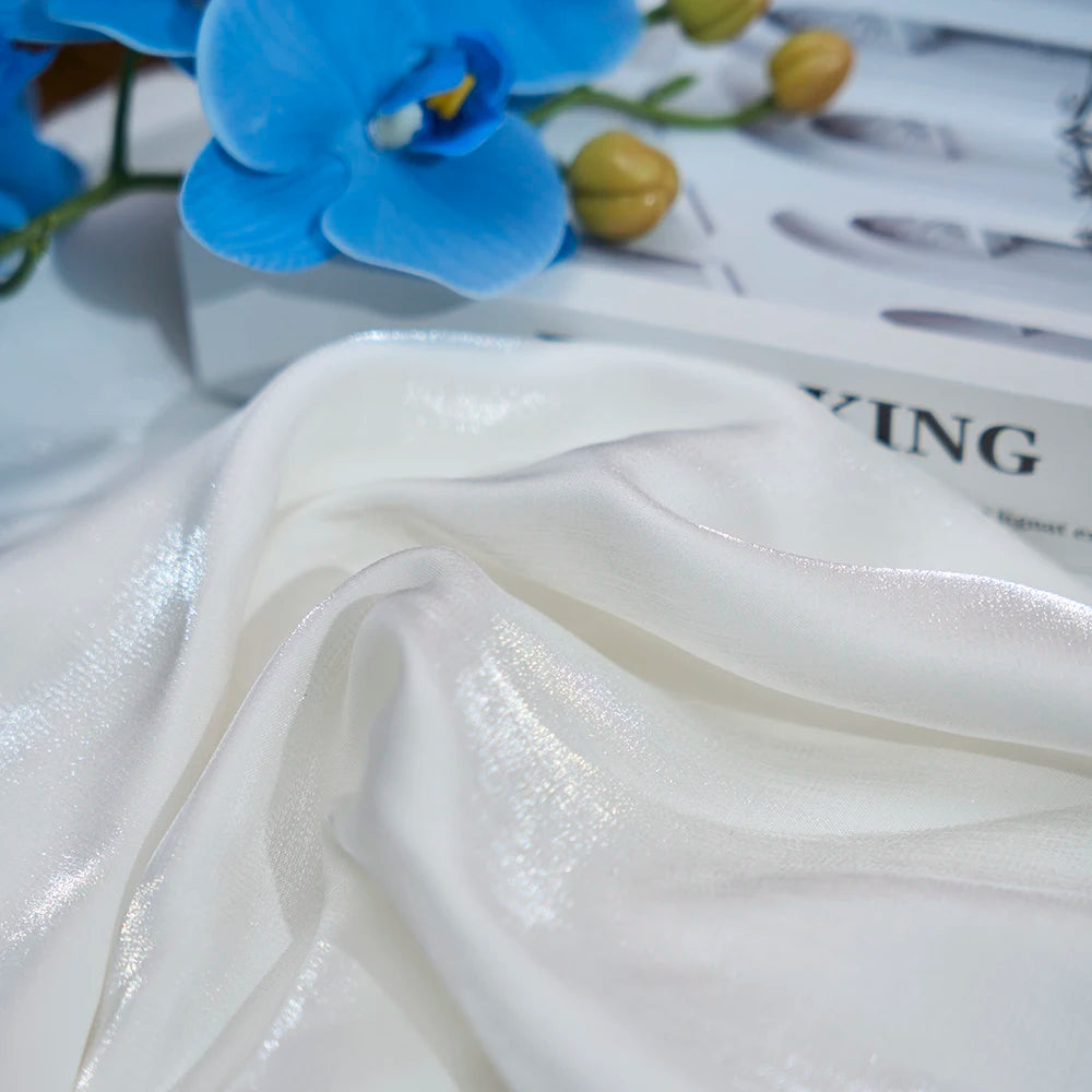 The fabric is lightweight with a natural drape and a non-elastic structure, ideal for flowing garments and statement pieces. Its anti-static properties help maintain a clean, polished appearance during wear.